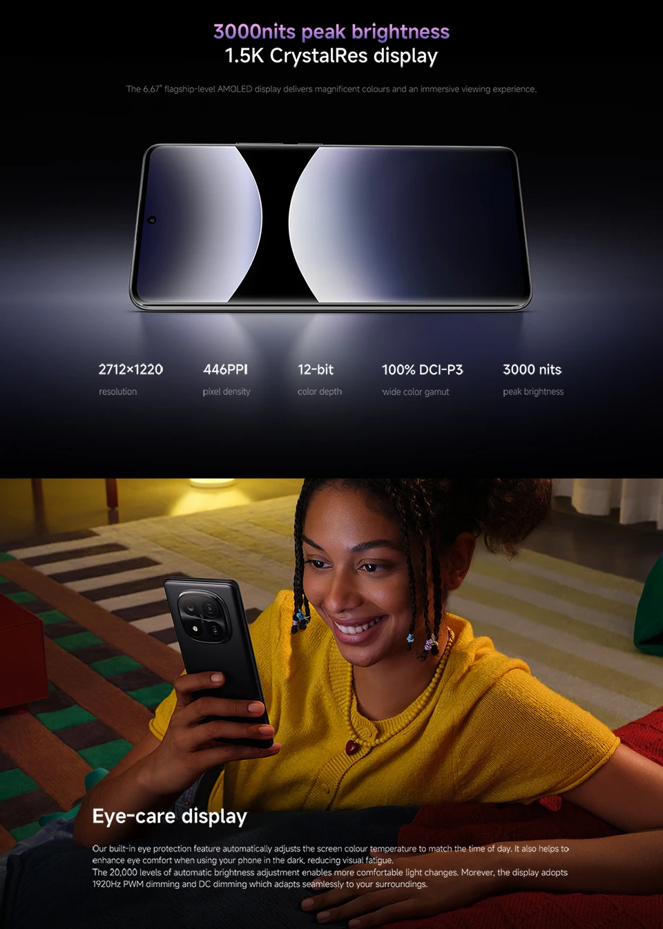 Screen ---------- 2712 x 1220 (1.5K resolution) Resolution, 6.67" CrystalRes AMOLED display, 120Hz refresh rate